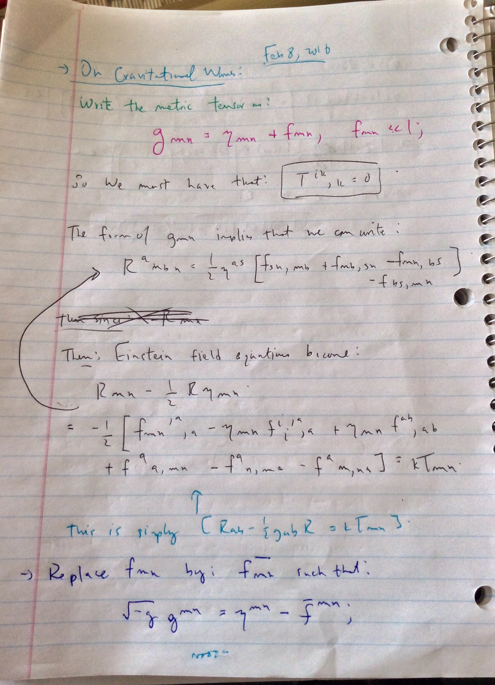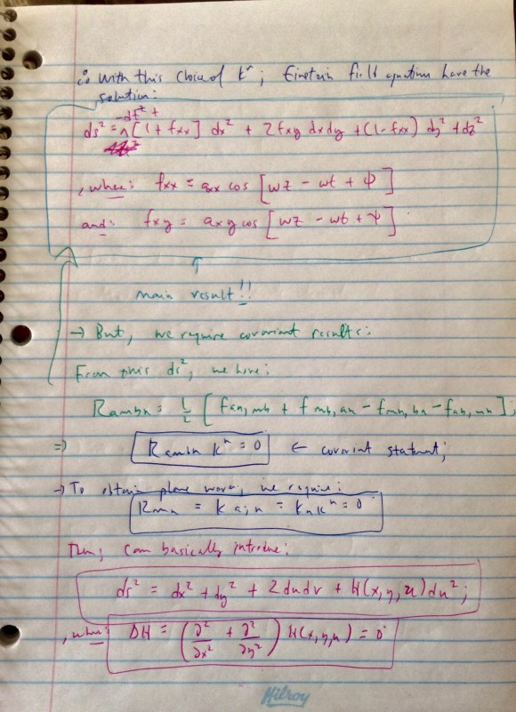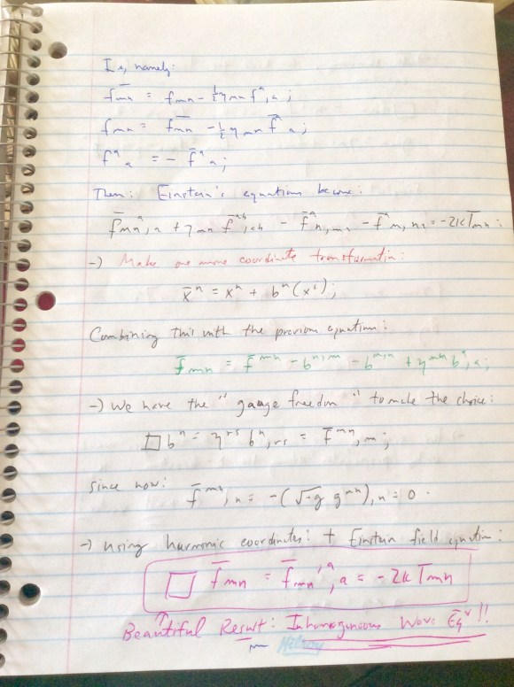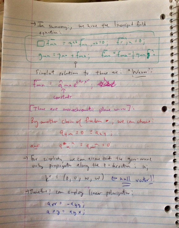 Since I expect the concept of gravitational waves to once become very popular in the next few days, I wrote some quick notes on them, I.e., where they come from. They are handwritten, as I didn’t have time to LaTeX them, but, hopefully, they’ll be useful to interested readers!