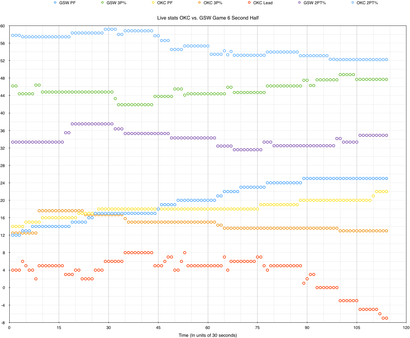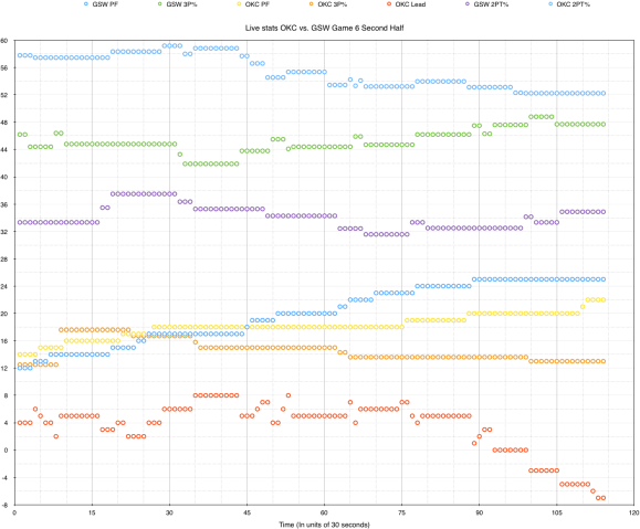 Continuing with the live metrics employed yesterday, here is an analysis of the second half of the Warriors-Thunder Game 6.