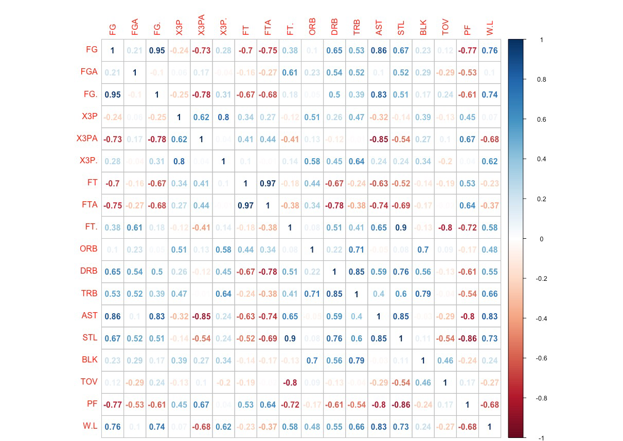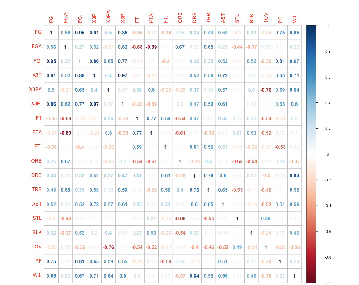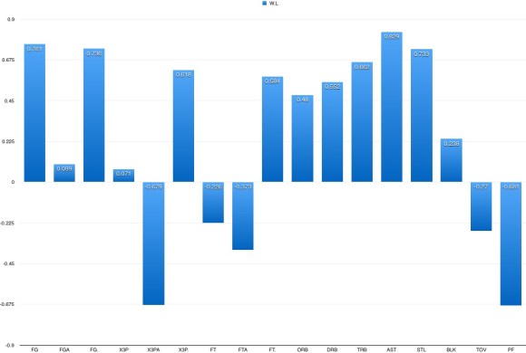 Now, Cleveland: A correlation plot of their per game predictor variables versus the binary win/loss outcome is as follows: