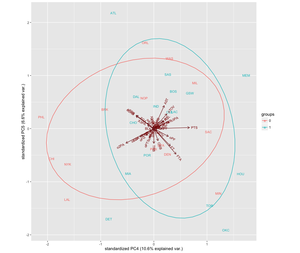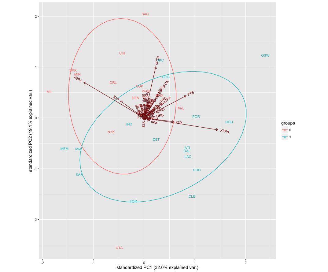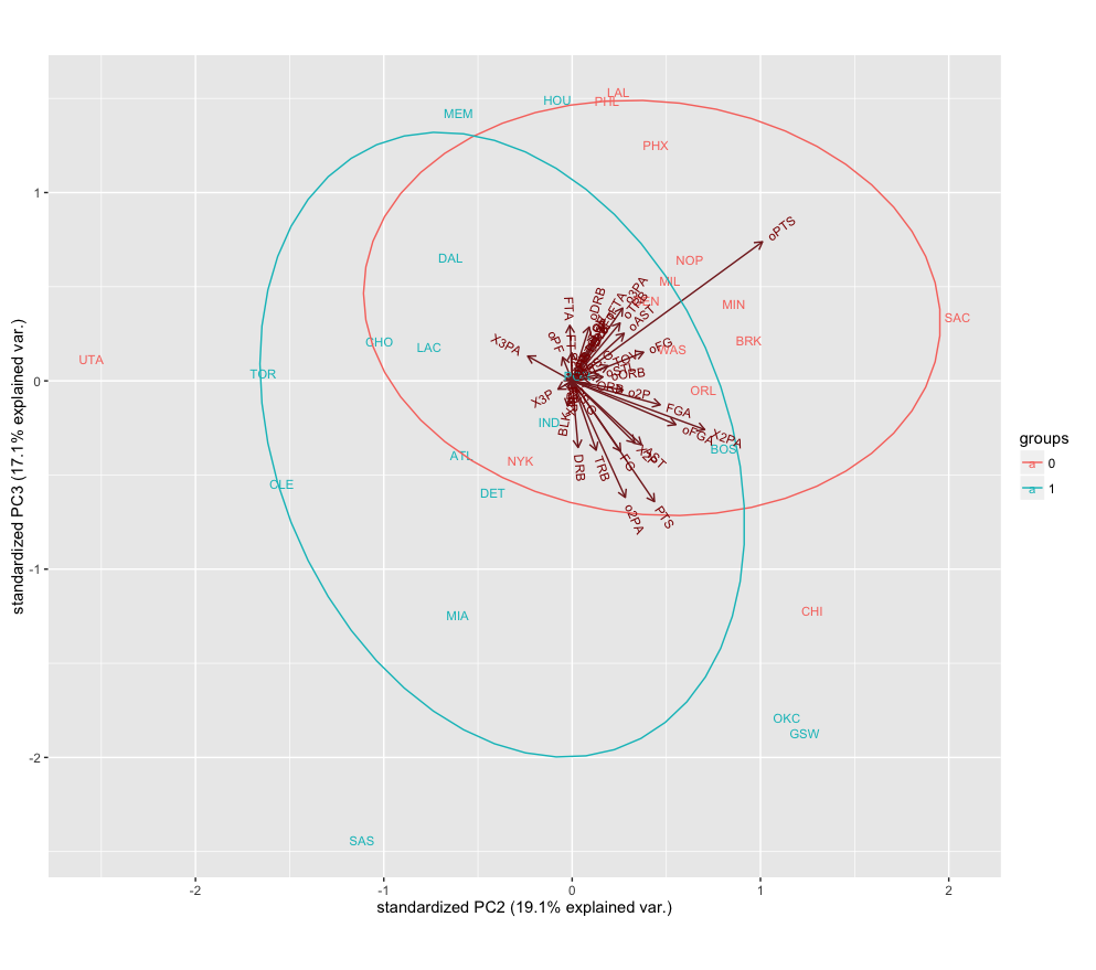 One sees from this biplot of the first two principal components that the dominant component along the first PC is 3 point attempts, while the dominant component along the second PC is opponent points. CLE and TOR have a high negative score along the second PC indicating a strong defensive performance. Indeed, one suspects that the final separating factor that led CLE to the championship was their defensive play as opposed to 3-point shooting which all-in-all didn’t do GSW any favours. This is in line with some of my previous analyses.
