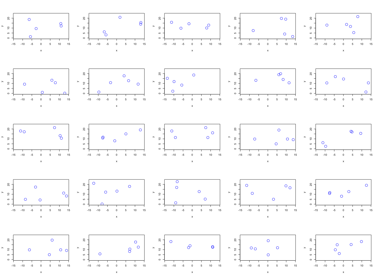Each plot above shows the x-y coordinates of players on the floor such that the distance between them is a maximum. Thus, these are some possible configurations of 5 players on the floor where the defense of the opposing team would be stretched to a maximum. What is even more interesting is that in each solution displayed above, and indeed, each numerical solution we found that is not displayed here, there is at least one triangle formation. It can therefore be said that the triangle offense is amongst the most optimal offensive strategies that produces maximum spacing of offensive players while simultaneously stretching the defense to a maximum as well. Here is more on the unpredictability of the triangle offense and its structure.